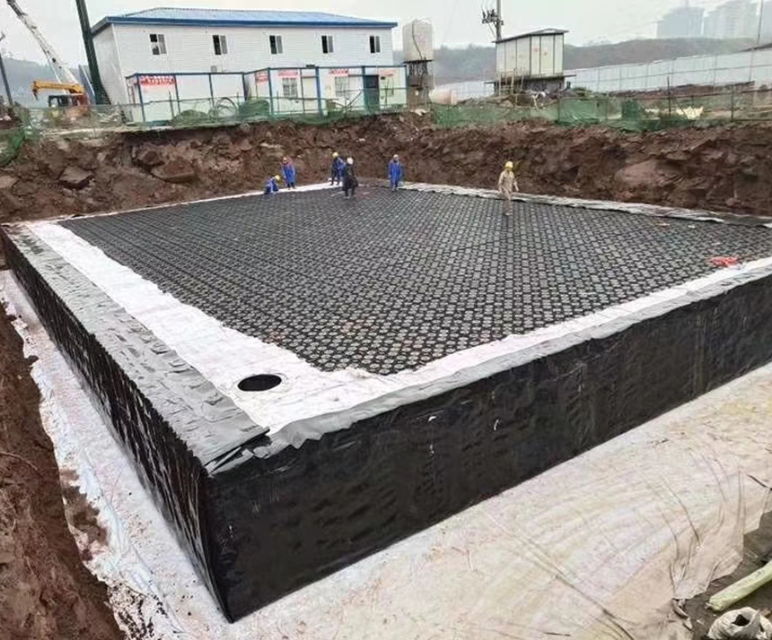 高分子防護排水異型片自粘土工布卷材是由高密度聚乙烯(HDPE)純白原料,在熔融狀態下經真空吸塑一次成型制成,制造出的單向連續密閉殼體型凸起的板狀材料,形成一種膜、殼連接,具有立+體排水空間和一定支撐剛度,液體、氣體可以在其內流動的防護排水卷材。